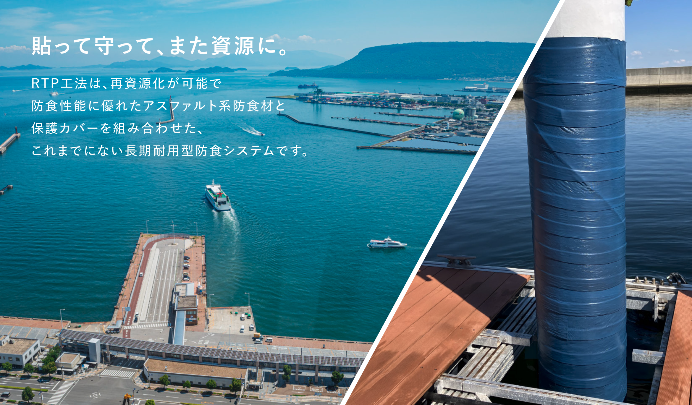 高度経済成長期に整備された港湾インフラの老朽化が進む中、維持管理における環境負荷低減とコスト縮減が喫緊の課題となっています。従来の「ペトロラタム被覆工法」は高い防食性能を持つ一方で、更新時に発生する廃棄物の処理や、施工工数の多さが課題でした。RTP工法は、「貼って守って、また資源に。」をコンセプトに開発された長期耐用型防食システムです。